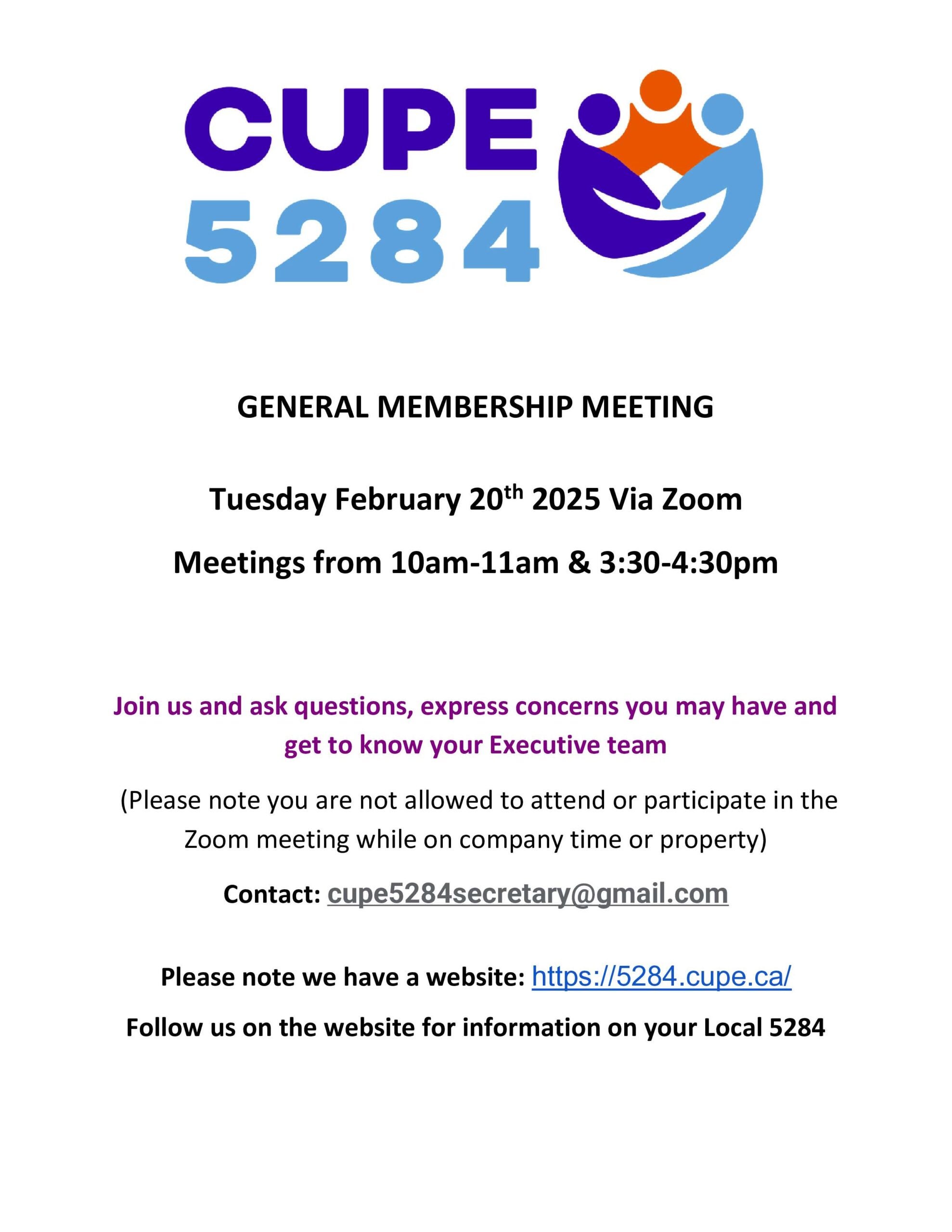 Topic: CUPE General Meeting February 20/25 @ 10-11am